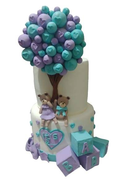 Bolo Fake no tema Chá Revelação com ursinhos e balões