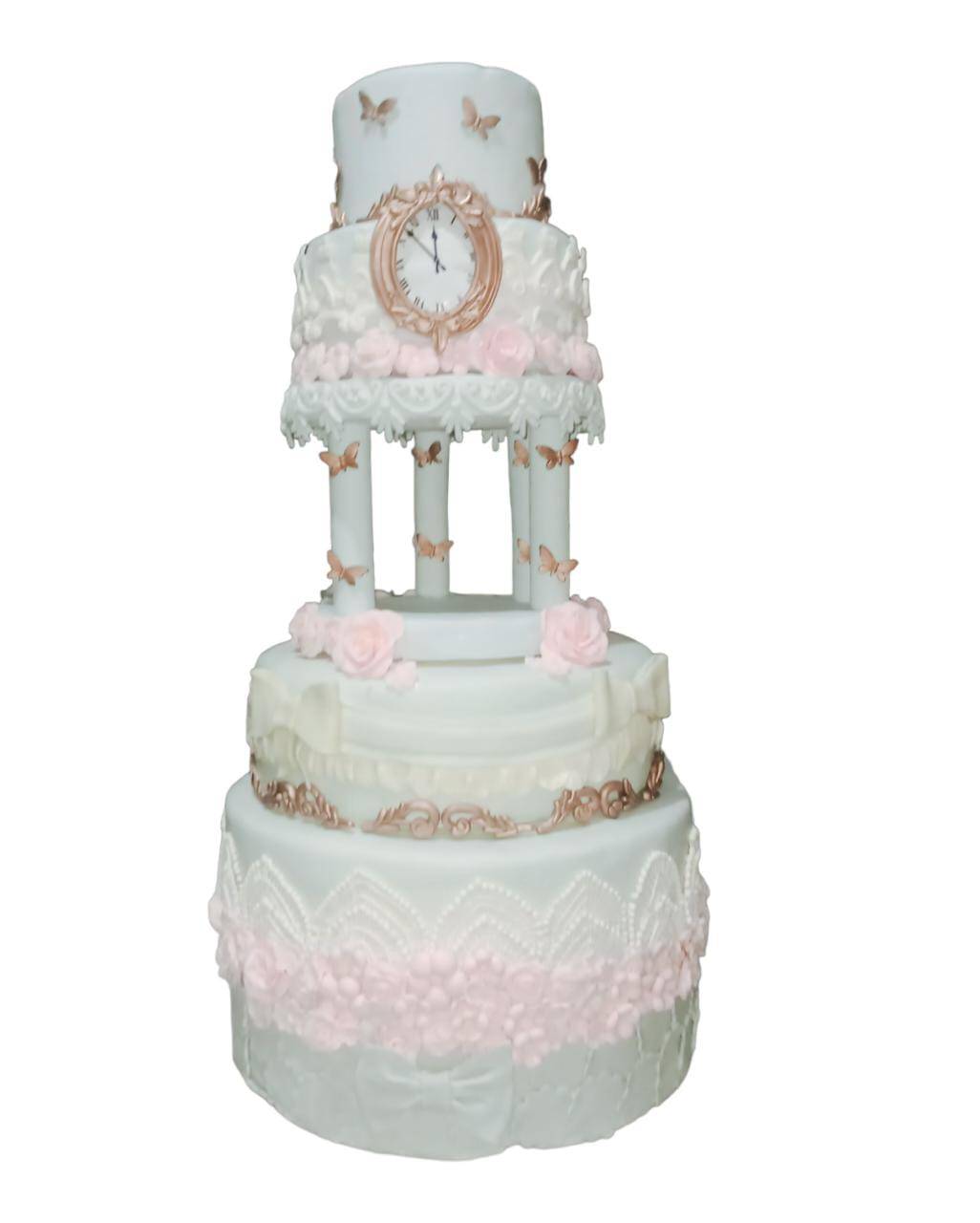 Bolo Fake de 5 andares branco com flores lílas e roxo